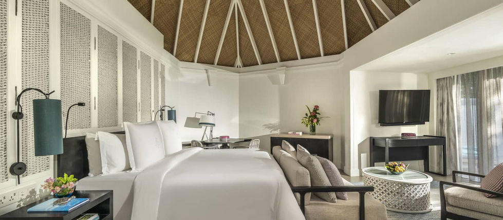 An artful sanctuary for family downtime in paradise, the Family Beach Villa with Pool connects a huge light-filled ensuite bedroom to a kids' bedroom with an attached bathroom. Outside, a spacious palm-shaded pool deck and tropical garden weave via a short sandy path to the turquoise lagoon beyond.